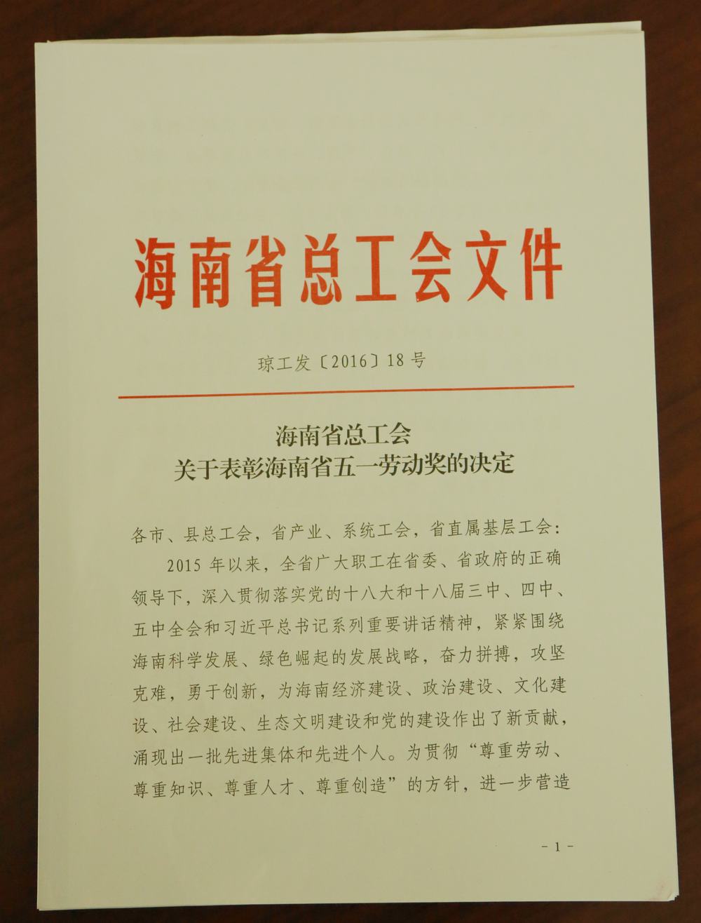 201653日下午,五一劳动奖表彰暨劳模座谈会在海口召开,公司获海南省五一劳动奖状。