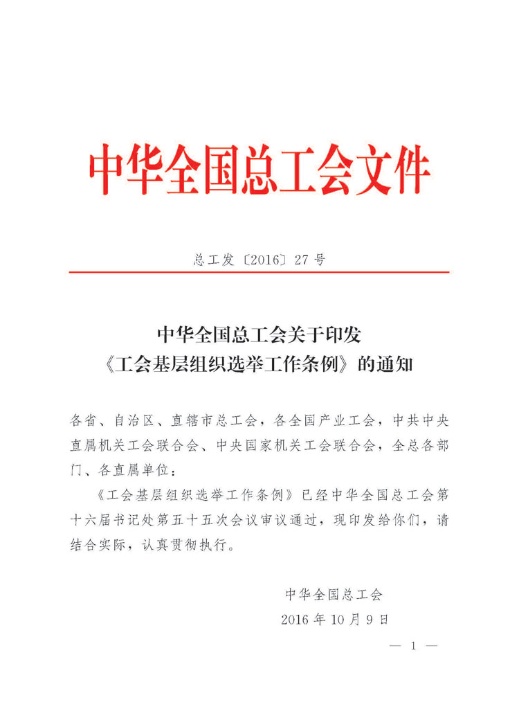 中华全国总工会关于印发《工会基层组织选举工作条例》的通知总工发[2016]27号
