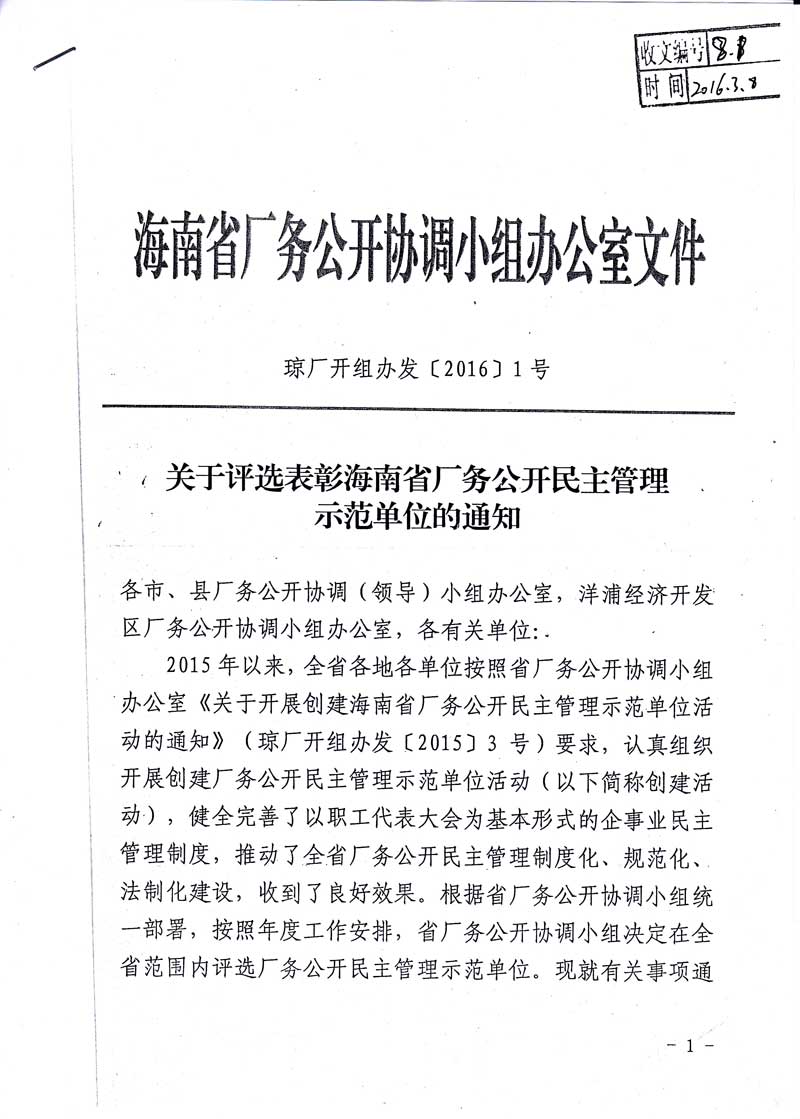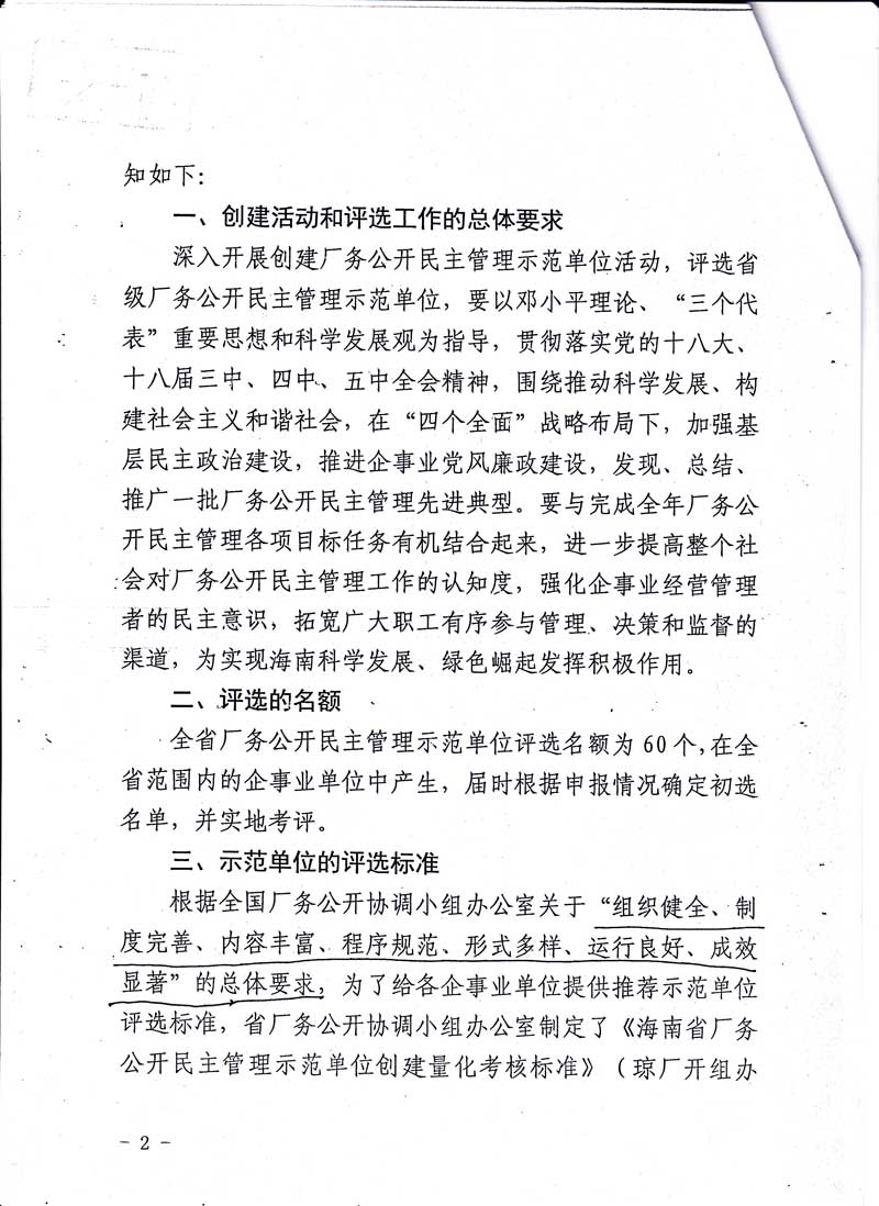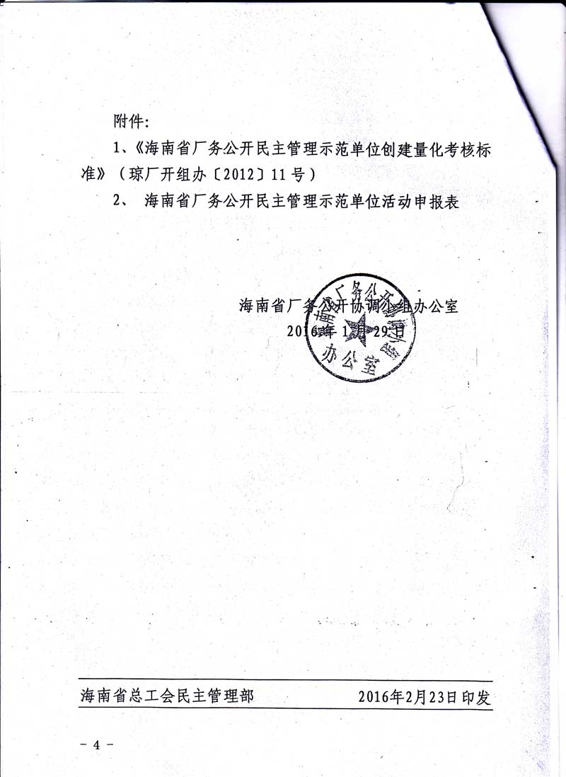 关于评选表彰海南省厂务公开民主管理示范单位的通知(琼厂开组办发[2016]1号)