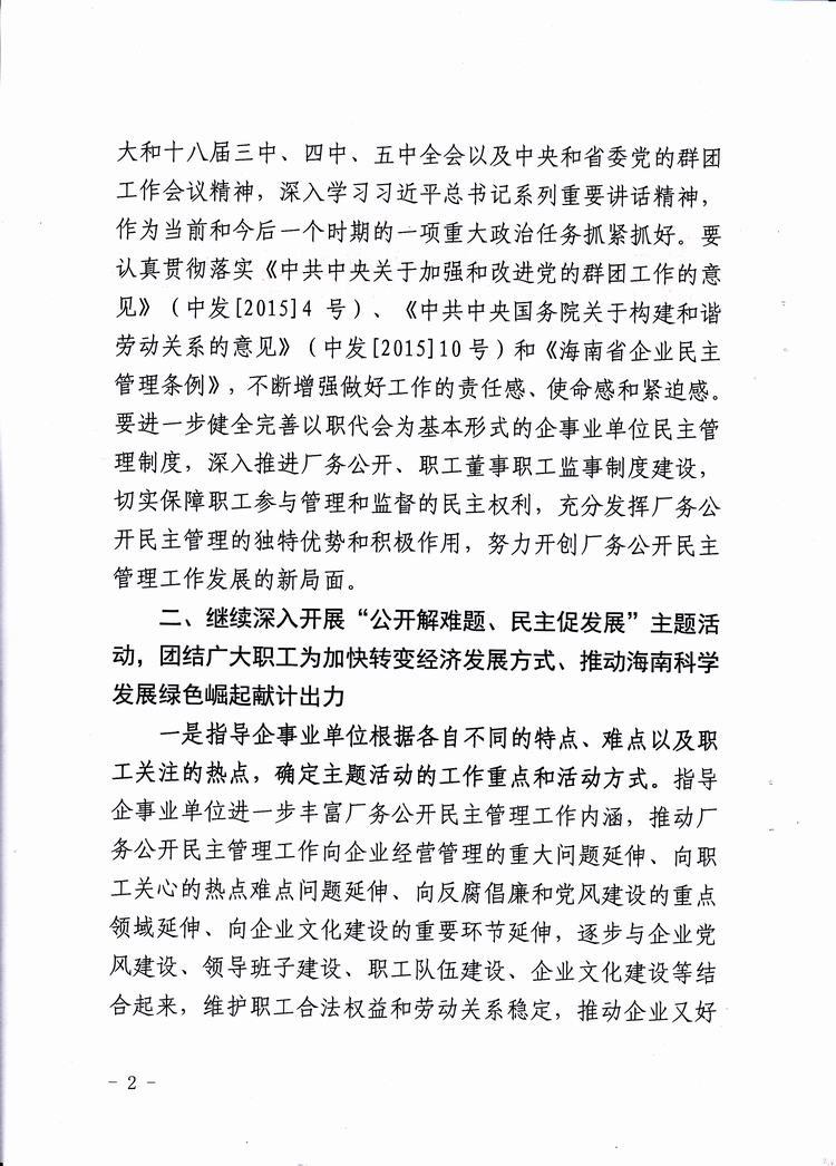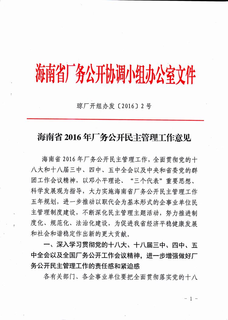 海南省2016年厂务公开民主管理工作意见,琼厂开组办发[2016]2号